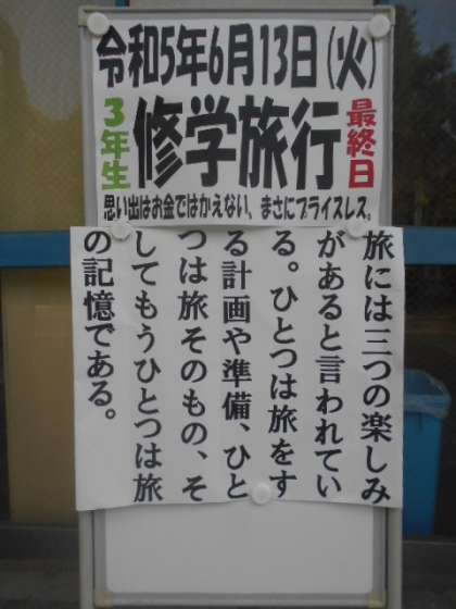 今日、3年生は修学旅行最終日を迎えました。現在朝食をいただき、この後浜名湖のホテルを出発してナガシマスパーランドへ向かいます。現地の天候は晴れ。これまで天候に悩まされてきた修学旅行ですが、最終日にご褒美をいただいたような気持ちです。