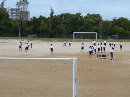 体育の授業では、バトンパスの練習に取り組んでいます。