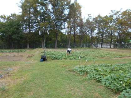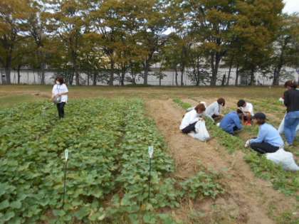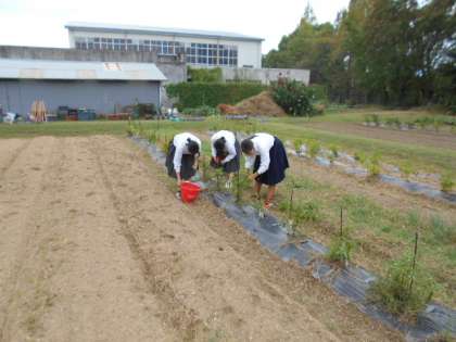 PTAのみなさんが大根の間引きをしている横では、子どもたちと教職員が緑化活動に取り組んでいます。