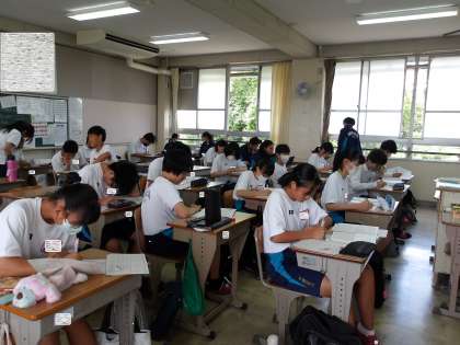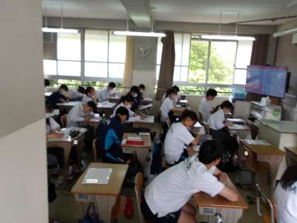 テスト一週間前の期間に入り、テスト範囲を終えた教科では、課題に取り組んでいるクラスも見られます。