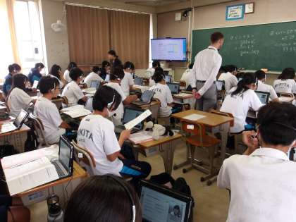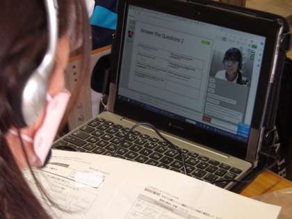 ネイティブのインストラクターの方と、パソコンの画面を介して子どもたちが何とかコミュニケーションをとろうと、一所懸命に、そして楽しく会話をしていました。