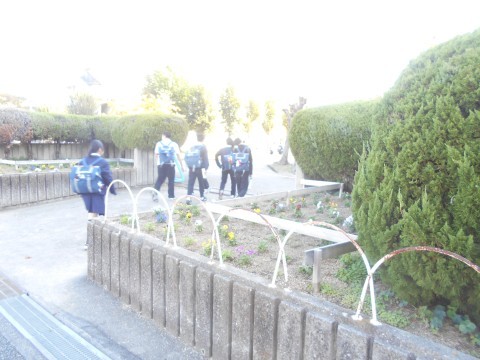 学校行事 みんな元気に登校してきました。 PTA環境委員さんにお世話していただいてる花壇の花もきれいに咲いています。