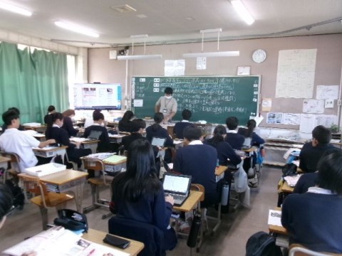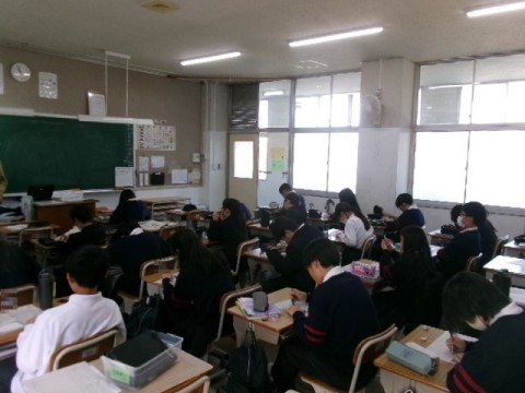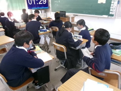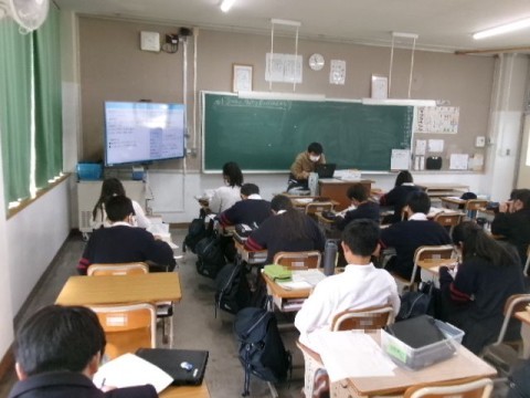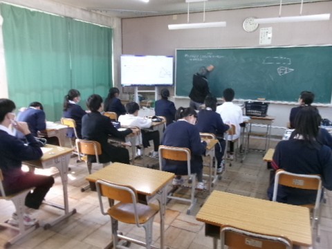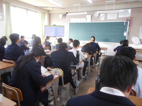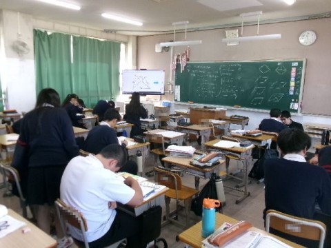 3年 +3 3年生の授業の様子です。 写真は、1組「数学(少人数授業)」、2組「社会」、3組「英語(少人数授業)」の様子です。 数学は、証明に取り組みました。中点連結定理を理解し、証明にいかしましょう。 社会は、「なぜ、国会議員はこんなに優遇されているのか?」を課題に、仮設・検証を行いました。 英語は、「when」や「why」を使った文章に取り組んだり、おすすめの作品を伝え合うための発表準備をしたりしました。