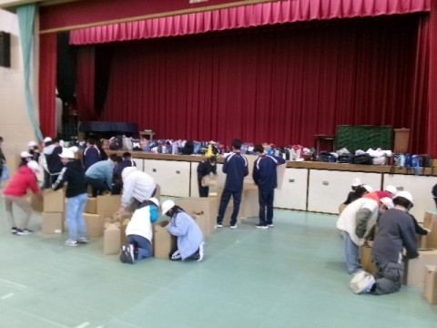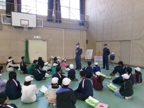 本日5・6限、2年生は校区両小学校5年生の児童と一緒に赤坂台学校群防災体験会を本校体育館で開催しました。