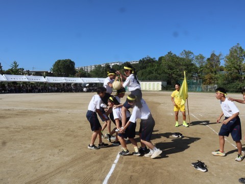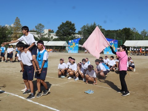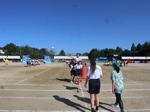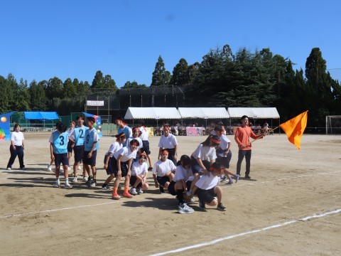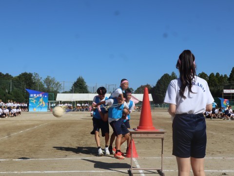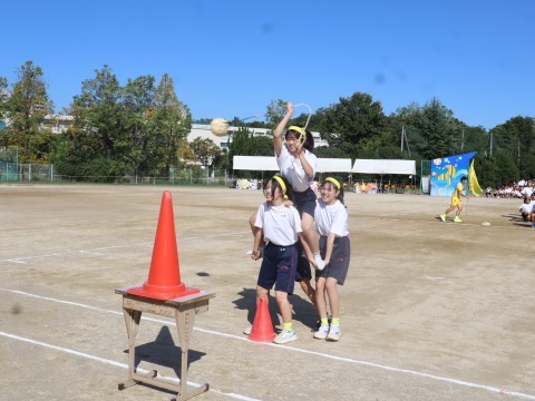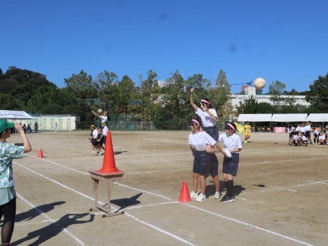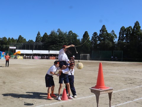 協力して騎馬で移動し、ボールでポールを倒していきました。