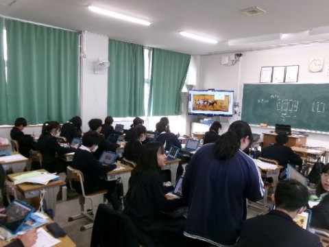 社会は、「アフリカ州のイメージは?」を導入として、「真ん中から上は砂漠、下は緑が広がる。色々な動物が住んでいる。」という仮説を立てて検証しました。タブレットを活用し、調べ学習を行っている様子です。