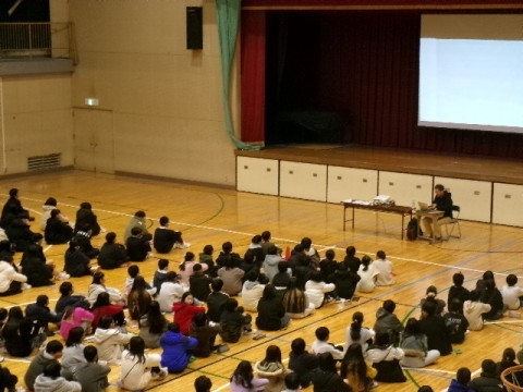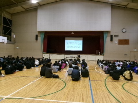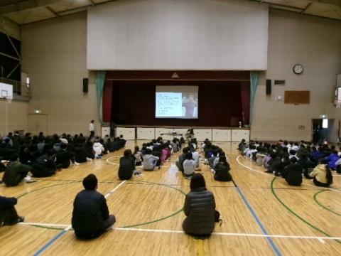 本日5・6限、2年生は赤坂台学校群防災教育講演会を体育館にて行いました。
