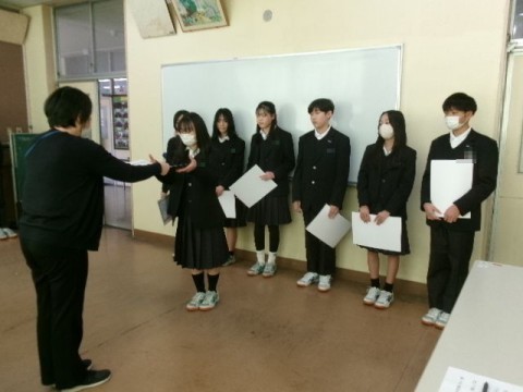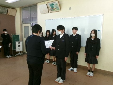 次に、生徒指導より、 ①SNS上に暴力行為やいじめの様子が挙がっているが、許されないことです。もし自分や周りの人に起こったときは必ず大人に伝えてください。 ②校則の見直し・意見をもらったものに対しての回答 ③3年生にとっては最後の定期全校集会です。良い卒業式になるようみなさん自身も身だしなみ等整えてください。 を話しました。