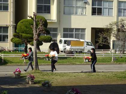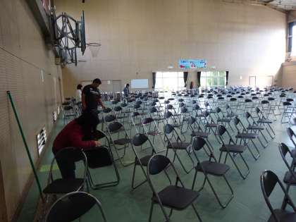 例年なら上級生もいっしょになって入学式の準備をしましたが,今年は職員だけで進めました。