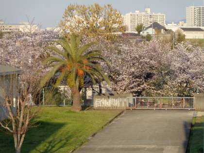 新2年生の教室のある南1棟への渡り廊下からのサクラです。廊下の両サイドの窓に美しい風景が広がります。