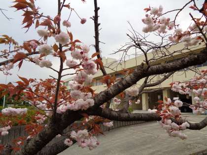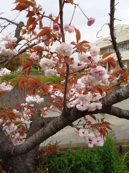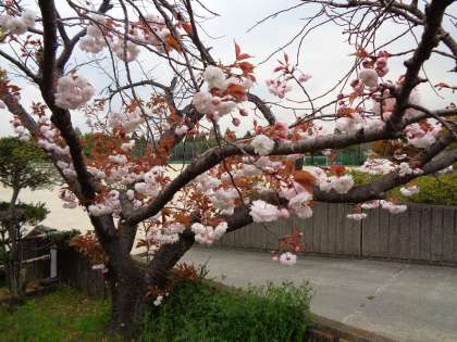 運動場に降りるスロープの脇に1本だけあって,ソメイヨシノの品種よりもやや遅れて咲きだし,少しだけ遅くまで花を楽しめます。ちょうど見ごろです。