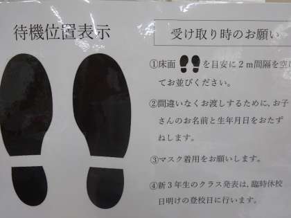明日は,すでにホームページでお知らせしているとおり,「3密」を避けるため,ご案内した時間帯での配布にご協力願いします。配布物を入れる大きめの袋をご持参のうえ,マスクを着用してお越しください。