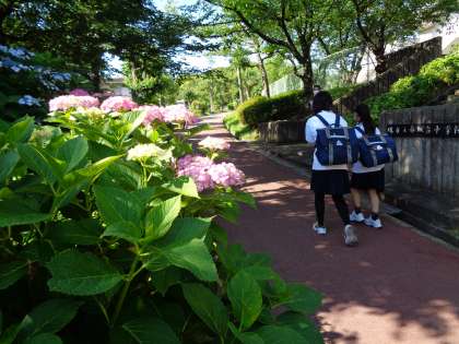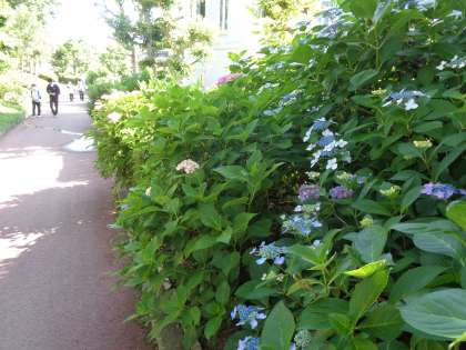 東門に続く緑道のアジサイがきれいです。