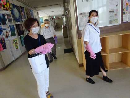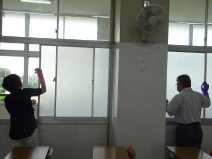 職員で消毒作業をしています。