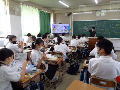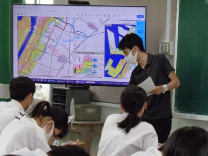 堺市の津波のハザードマップを使って,国内での自然災害についての学習をしました。