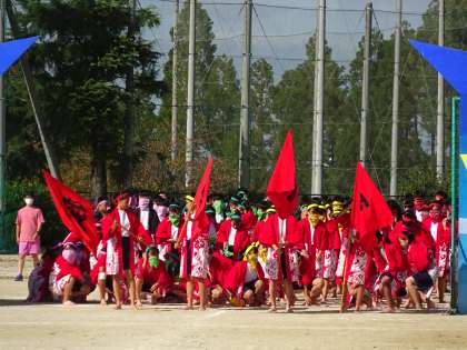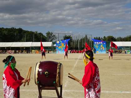 いよいよ最後のプログラム「3年生男女合同ソーラン」です。全員で円陣を組んで,気持ちを一つにして始めます。