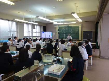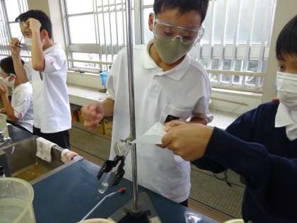 7時間目に1年生の公開授業が行われました。理科では,アンモニアの性質を調べる実験が行われました。安全面に気を付けて,班で協力して行っていました。