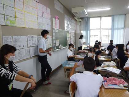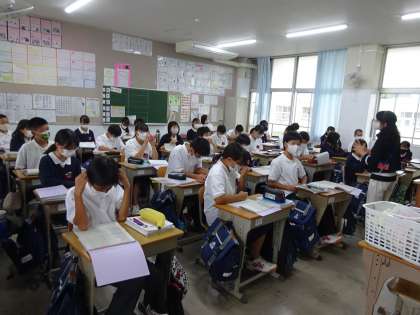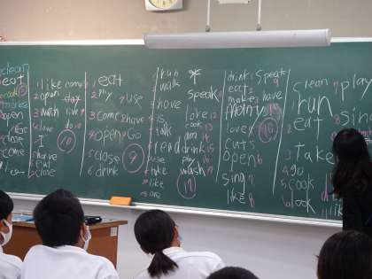 英語では「3単現のS」について学習しています。また,ゲーム形式でたくさんの動詞を書き出すチーム戦を行いました。小学校の先生も見学に来られました。