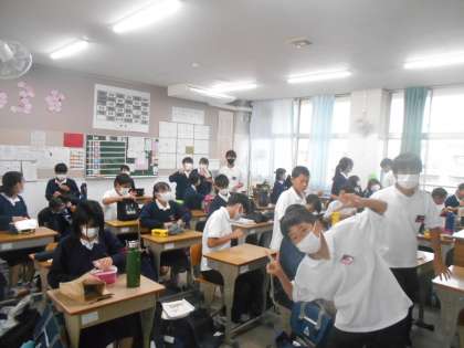 今日は7時間授業でお昼休みが少し短めなので,1年生は体育の後,準備ができた人から食べ始めています。
