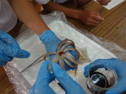口から醤油を入れて胃の変化を観察。また,眼球を外してレンズを取り出し,文字がどのように見えるかを観察しました。