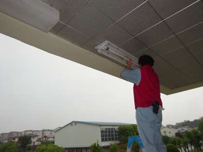 玄関前の電灯を交換してくれています。日が暮れるのが早くなったので,生徒たちの最終下校時間には点灯します。
