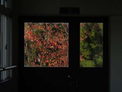 昨年の今ごろにも南1棟の廊下からの紅葉を紹介いたしましたが,今年もきれいに色づきましたので,島根県にある額縁ふうに外の景色を見せてくださる美術館を真似てご披露いたします。