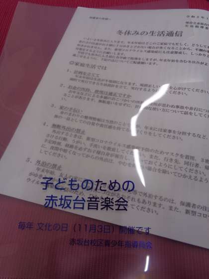 赤坂台青少年指導委員会様からクリアファイルをいただきました。「生徒のみなさんに配って,使ってもらってください。」とのことです。大切なプリントなどを持ち帰るときなどに重宝しそうですね。