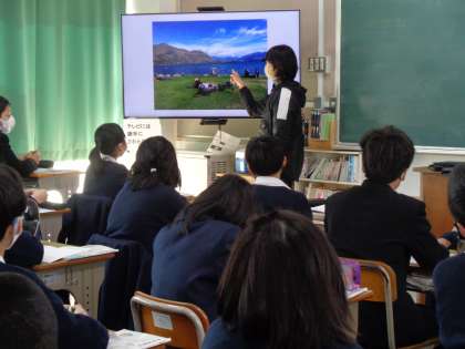 写真は自然について生徒たちが話し合う際に,担当教員自らが撮影した自然を表す写真を紹介しているところです。