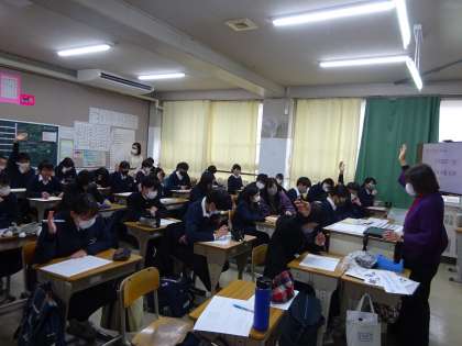 今日は,三原台中学校から日本語学級を担当している先生をお招きして,道徳「異文化体験 おもいやり」の授業をしていただきました。