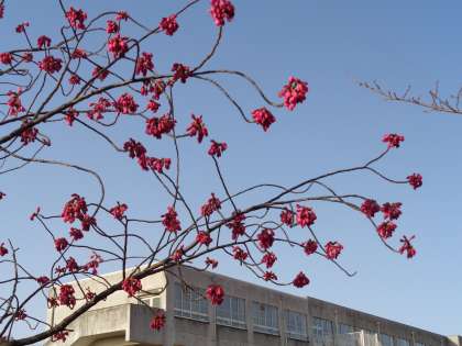 カンヒザクラが東門の近くに植えられています。漢字では「寒緋桜」と書きます。赤いつぼみが大きくふくらんで,まもなく花が開くのかと思います。