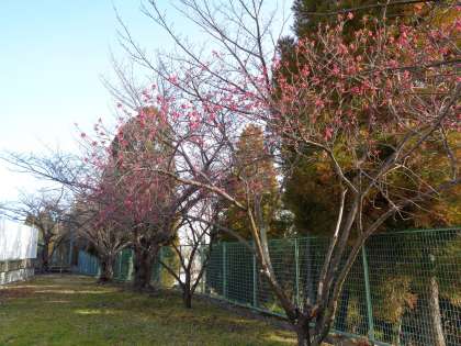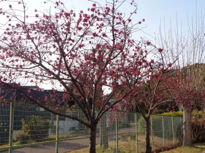 地域によってヒカンザクラ(緋寒桜)とも言いますが,ヒガンザクラ(彼岸桜)とは違う種類です。早咲きの品種で,昨年も通りがかった地域のかたが「色が濃く,鮮やかで,きれいですね。」と声をかけてくださりました。