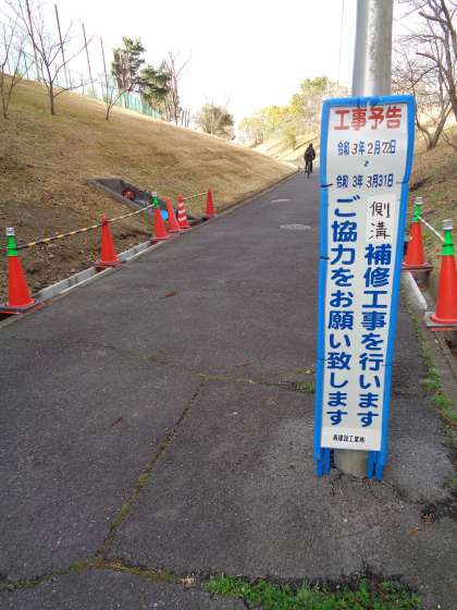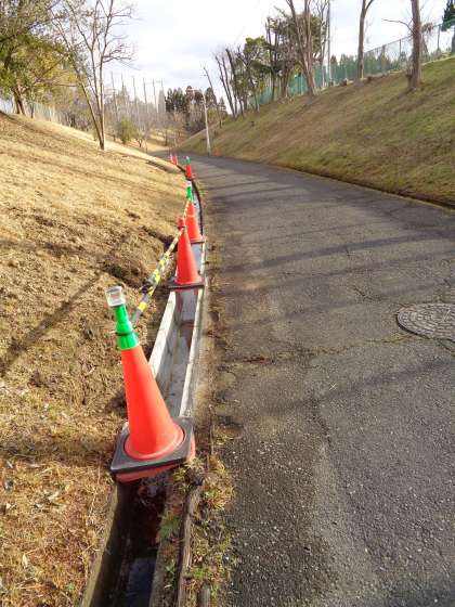 小学校との間の緑道の,側溝ブロックの破損や傷み(いたみ)の激しいものを補修したり取り替えたりする工事が,堺市南部整備事務所の管轄で,現在おこなわれています。安全に配慮し,通行に支障のないように,時間帯も考慮しながらおこなっているとのことです。