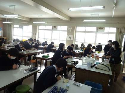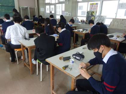 美術の授業では,篆刻を学習しています。集中して丁寧に仕上げています。