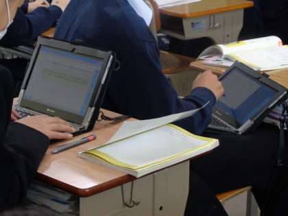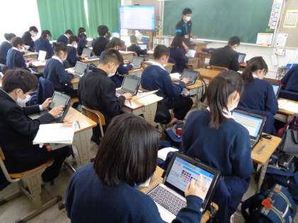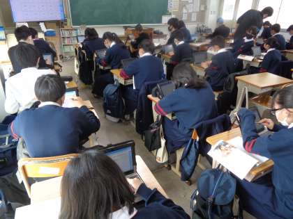 端末を操作して自分の意見を述べ,それらを大きな画面ですべて映し出し,ほかの人の意見と比べます。