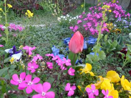PTA活動で委員さんたちが植えてくださり,水をまくなどの手入れを続けてくださっているチューリップが少しずつ咲きだしています。卒業式に間に合うようです。