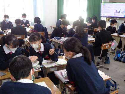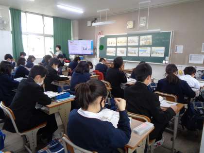 英語で書かれた長い作品を通して全員で読み,そのあとグループごとに,役割を決めてどのように読むかを相談しました。