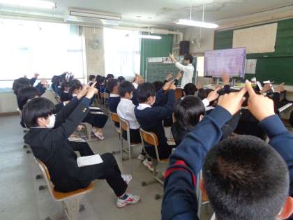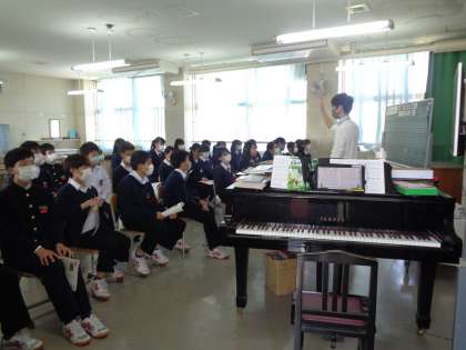 歌うときに声を出しやすいよう,授業の最初に発声練習を含め,いろんな動作をします。