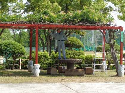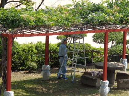 昨年度は基礎部分の補強もおこないましたが,ずっと屋外にあって,なおかつ,フジのつるが絡まって梁(はり)の部分が擦れる(こすれる)ため,これまでも何度か塗装をしなおしています。