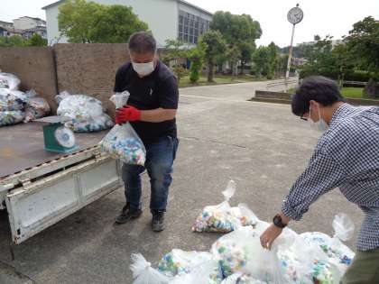 生徒会で取り組んでいるエコキャップの回収運動ですが,2日(水),この運動でエコキャップを再資源化してくださる業者さんに引き渡しました。再資源化により売却したお金を,支援団体が発展途上国のポリオワクチン購入などの費用に充てて役立てます。
