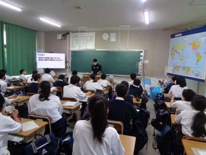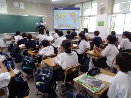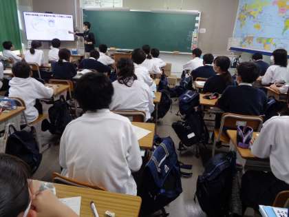 地理的分野の授業です。世界地図のいくつかの種類はそれぞれどういったときに使えばいいのか,地球儀はどのようなときに活用すればいいのかなども教わりました。