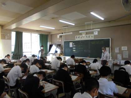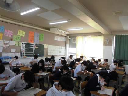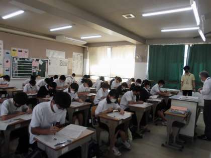 2日目のテストの様子です。ちょうど,教科の先生も,教室に入り,質問がないかどうかの確認をしています。