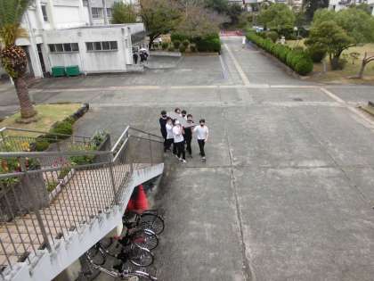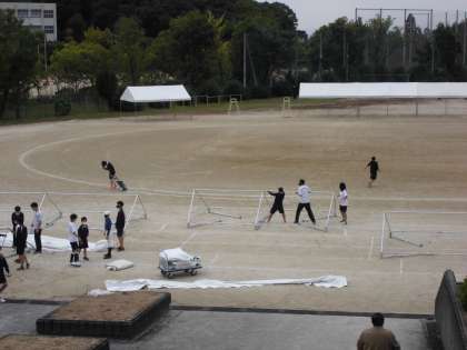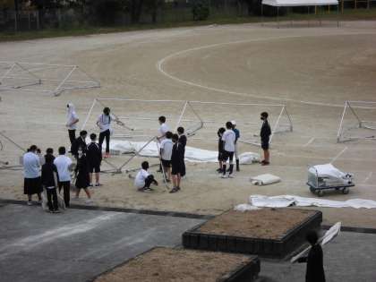 元気な声が聞こえてきました。長机を2階からグランドへ運んでいます。
