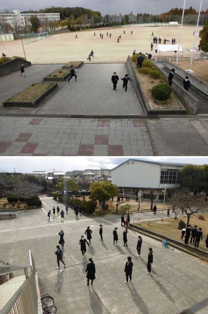 グランドを見ると,サッカーをしている生徒や,鬼ごっこをしている生徒がいます。