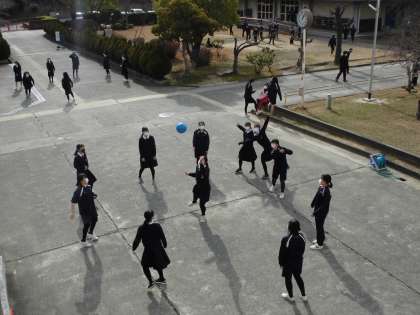 校舎の反対側を見ると,ボールを使ってたくさんの生徒が遊んでいます。