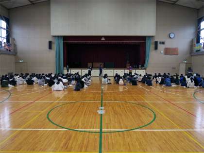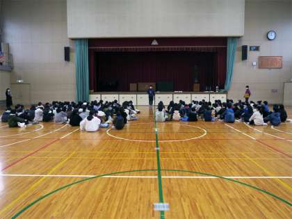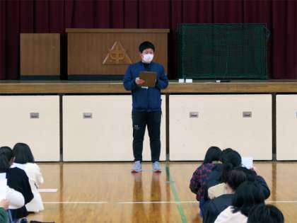 青色の名札の確認をしたあと、「新入生のみなさんへ」のプリントを配布し、入学式当日の連絡をしました。