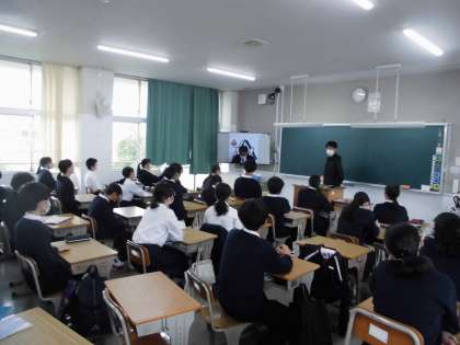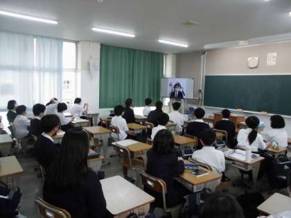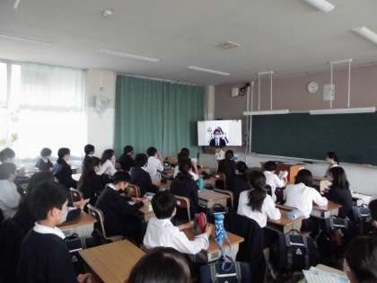大型テレビに映し出される先生の方を見て、しっかりと聴いていました。