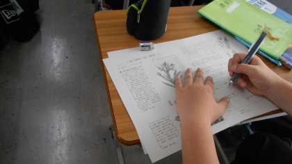 1年生の理科の授業の様子です。被子植物と裸子植物についてプリントでまとめ、違いなどを考えていきました。