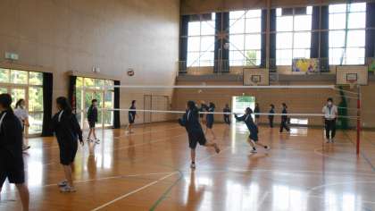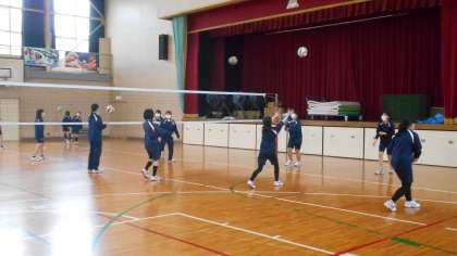 3年生女子の体育の授業の様子です。バレーボールのパスの練習をしています。どうすれば相手が受けやすいボールになるのかを考えながら取り組みました。