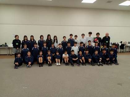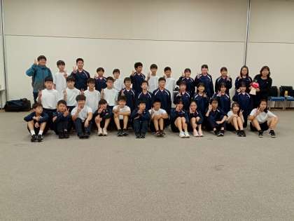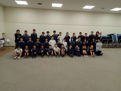 琵琶湖アドベンチャーの施設内で宿泊学習で1枚めの集合写真を撮影しました。あかっしーも一緒です!