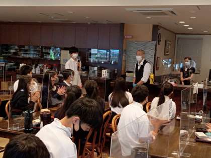 お世話になった宿舎の方々に代表の生徒がお礼を伝えました。全員からも大きな拍手でお礼を伝えました。一泊二日の間ありがとうございました!